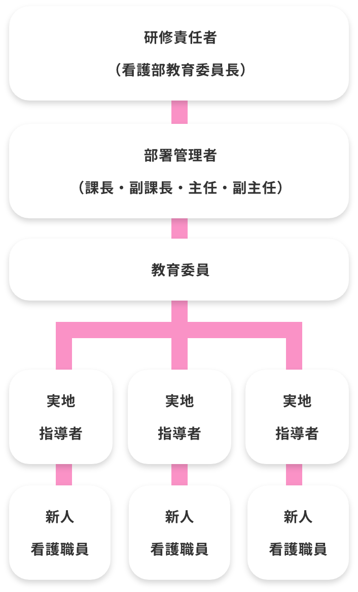 新人看護師の入職後1年間は1対1で実地指導者が担当し、技術面・精神面のサポートをします。実地指導者は、レベル4以上の看護師が当院規定の実地指導者養成コースの研修を受け、各部署の新人指導計画表をもとにし、新人1人1人に合った指導を実施します。院内統一のチェックリストを使用し、部署全体で技術指導ができるよう、新人看護師を支える体制を整えています。また、既卒者に対しても能力や要望に応じて、実地指導者が担当し成長を支援しています。